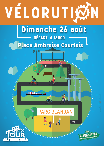 Le 26 août, les cyclistes du Tour Alternatiba vous donne RDV à 16h place Ambroise Courtois pour les accompagner le temps d’une vélorution jusqu’au parc Blandan !