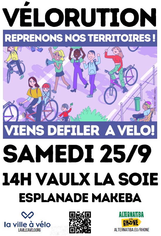 Dans le cadre d’une journée de mobilisation nationale, une déambulation engagée et festive à vélo se prépare dans le Grand Lyon. Alternatiba ANV Rhône et La Ville à Vélo organisent une vélorution le samedi 25 septembre à 14h au départ de l’esplanade Makeba à Vaulx-en-Velin (métro Vaulx-en-Velin La Soie) pour revendiquer un changement de la politique des transports permettant de vivre dans un territoire apaisé, plus convivial et soutenable.