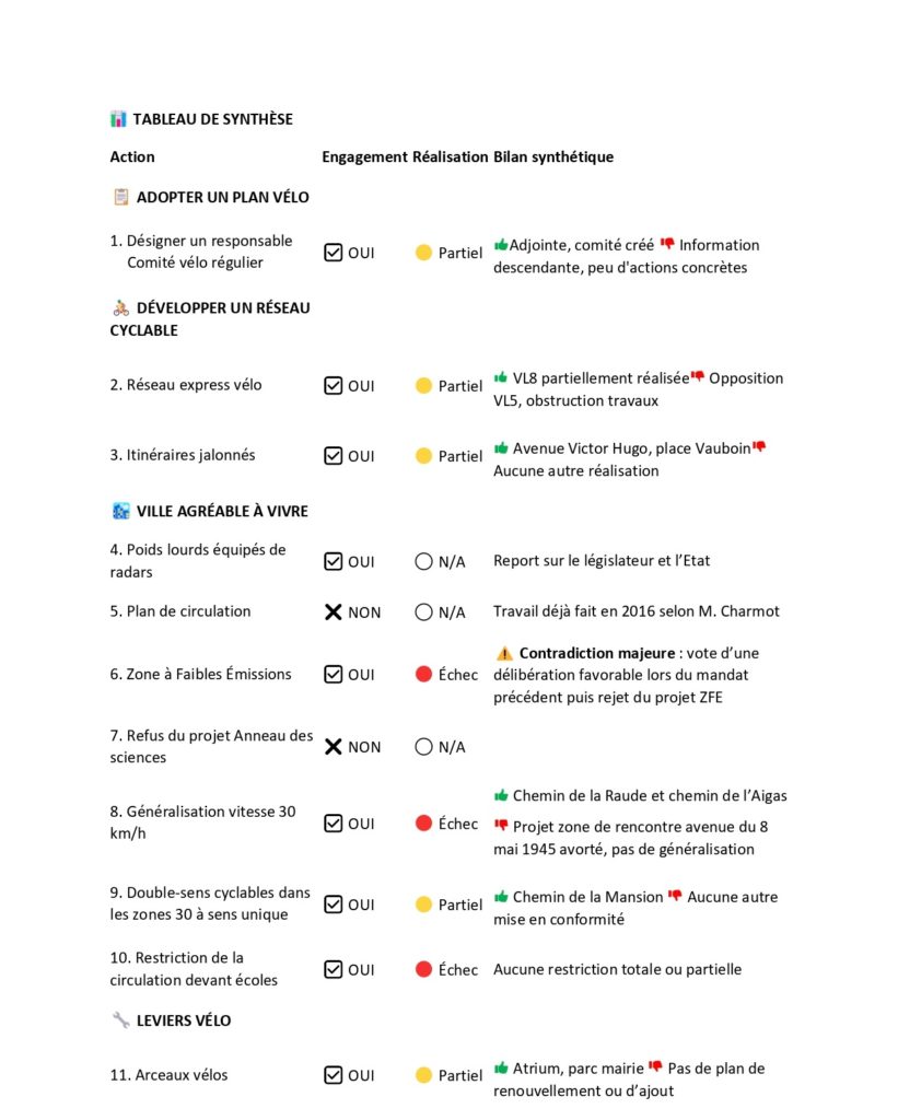 - Comité vélo : installé en début de mandat, il s’est réuni régulièrement (même si son rôle est resté limité à une information descendante).