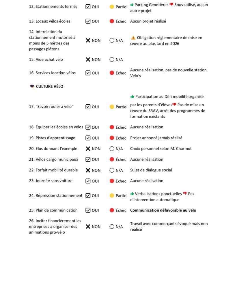 Au-delà des infrastructures, une politique vélo ambitieuse doit aussi reposer sur des services adaptés, pour faciliter l’usage au quotidien. M. Charmot avait refusé de s’engager sur des aides à l’achat ou encore sur des services municipaux exemplaires. Mais, même sur les engagements pris, le mandat de M. Charmot est décevant :