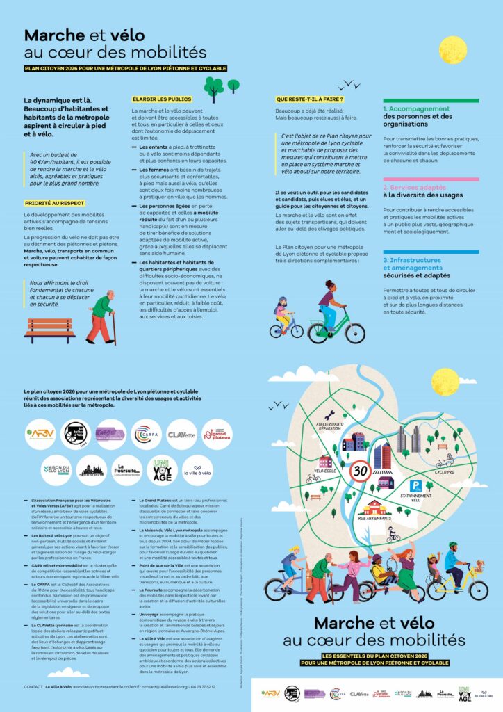 À l’approche des échéances électorales de 2026, La Ville à Vélo et une dizaine d’associations dévoilent un Plan citoyen pour une métropole lyonnaise tournée vers la marche et le vélo.