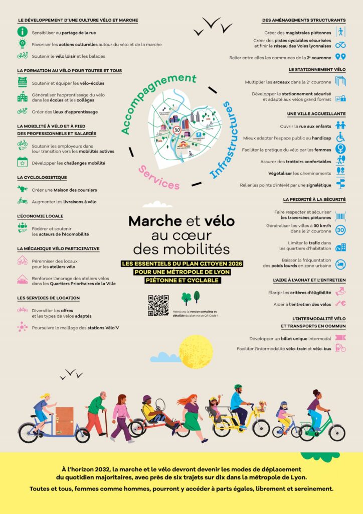 Nous fixons un objectif clair : à l’horizon 2032, la marche et le vélo doivent devenir les modes de déplacements du quotidien majoritaires dans la métropole de Lyon. Nous affirmons le droit fondamental de chacune et chacun à se déplacer en sécurité à pied et à vélo.