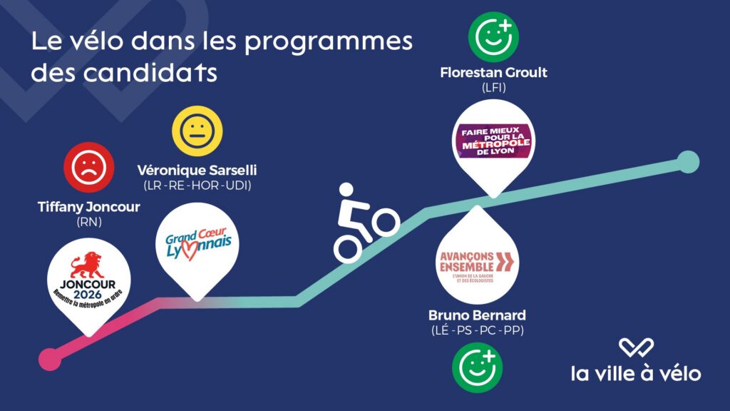 - Le programme de l’union de la gauche et les écologistes (Bruno Bernard) est ambitieux sur le sujet du vélo, et s’inscrit dans la continuation des réalisations du précédent mandat, avec notamment le projet d’achèvement des Voies Lyonnaises.