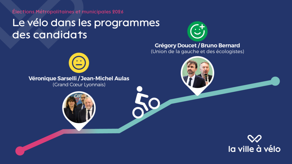 Pour aider les électrices et électeurs à faire leur choix dimanche, La Ville à Vélo publie le bilan des programmes vélo des duos Bruno Bernard/Grégory Doucet et Véronique Sarselli/Jean-Michel Aulas, aujourd’hui seuls duos susceptibles d’emporter la Ville de Lyon et/ou avoir une majorité métropolitaine.
