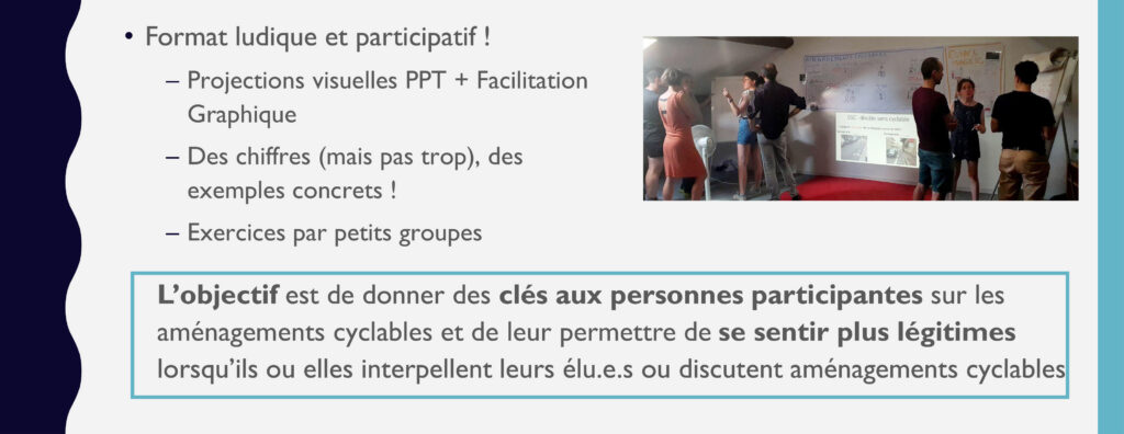 En tout c’est plus de 11 ateliers qui ont déjà été réalisés sur les sujets liés au plaidoyer. Cela équivaut à environs 170 personnes de formées sur les enjeux des aménagements cyclables !