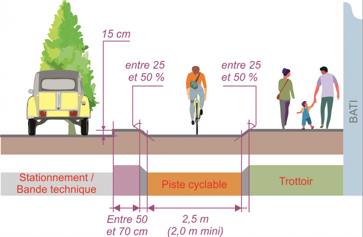 - Une différence de niveau lisible pour les piétons (repérage visuel et tactile), tout en restant franchissable pour le cycliste.